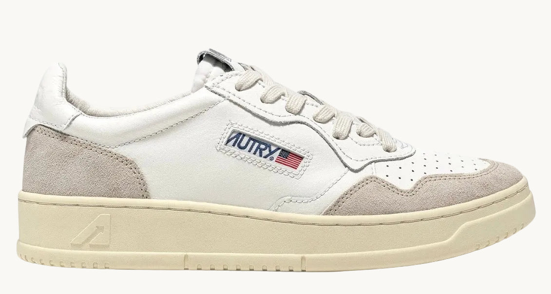 Cette sneaker pour homme è est réalisée en cuir blanc souple à l’aspect authentique et est finie avec des renforts en suede beige pour un mix tactile et graphique marqué. Le détail en cuir qui décore le talon est personnalisé avec le logo Autry.