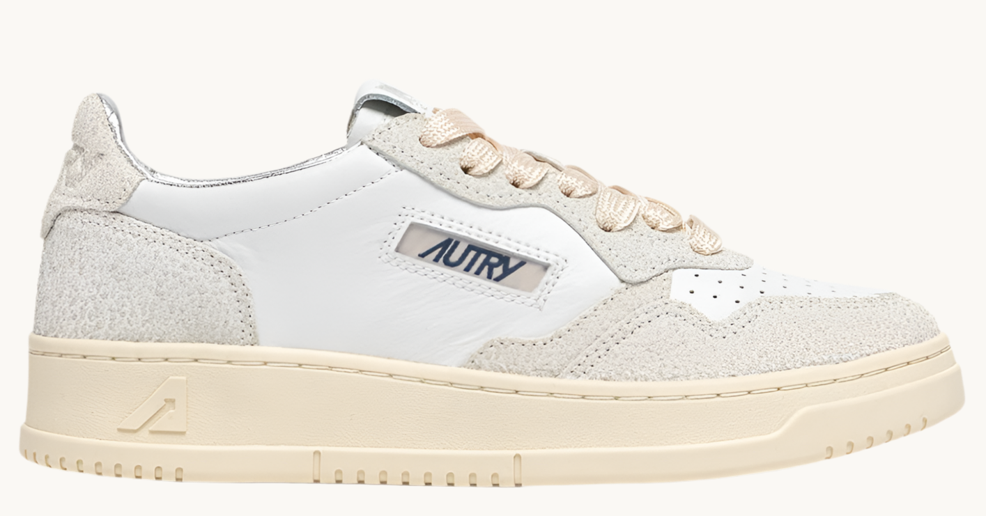 La Medalist d'Autry inaugure une nouvelle ère de style et de confort. Avec un profil bas à la cheville, cette basket pour femme est fabriquée en cuir de chèvre blanc et présente des empiècements en daim « shiny » élégant, avec un onglet arrière assorti. Les fines particules brillantes ajoutées au daim sont discrètes mais très hype. Le cuir de chèvre est reconnu pour sa souplesse et sa résistance accrues. Il est super-confortable et plus léger au porté que le cuir traditionnel.